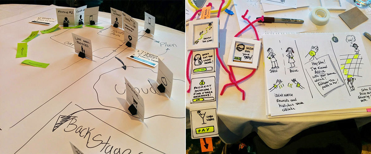 Nell’arco della giornata, divisi in gruppi di 6 o 7 persone, abbiamo ideato un’applicazione partendo da uno storyboard e siamo arrivati a costruire un prototipo di cartone. L’obiettivo era farlo testare a Patrick e Nick mettendo in scena la situazione reale di utilizzo. Il nostro MVP sarebbe stato verificato se loro fossero riusciti a comprenderne da soli l’utilizzo. Un vero test con l’utente!